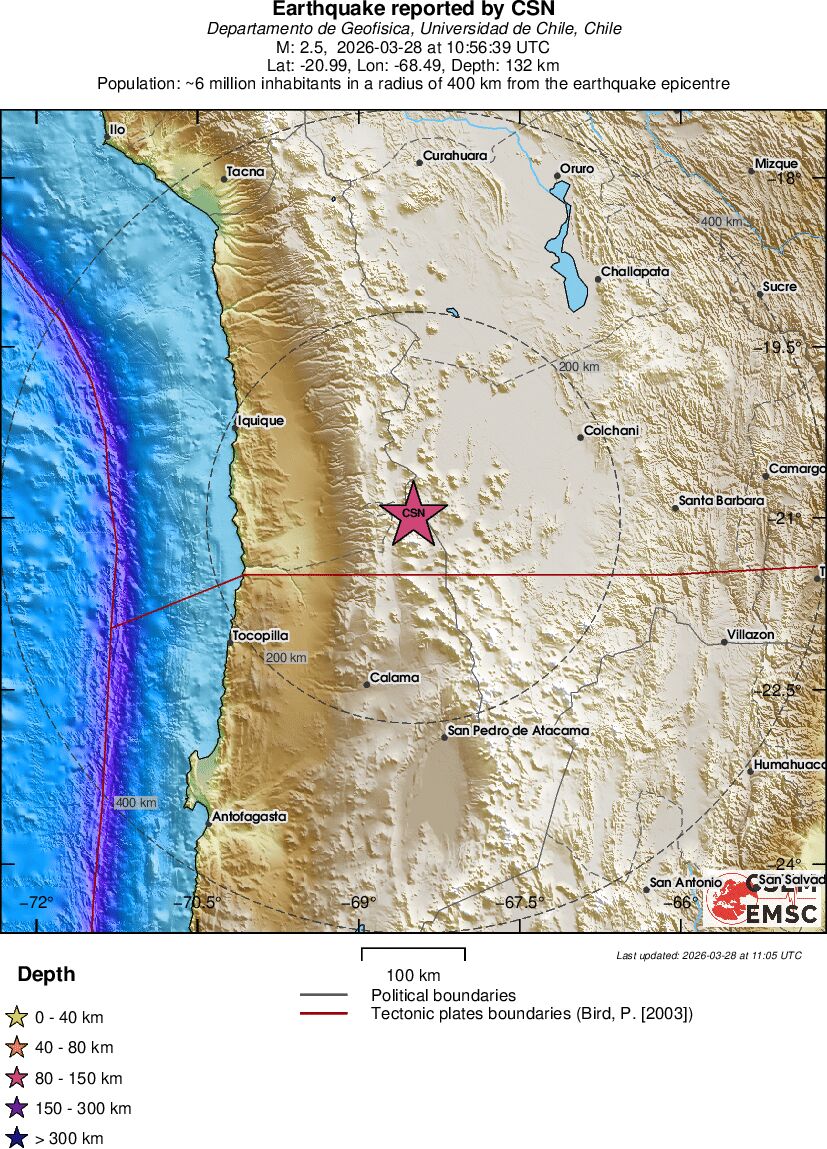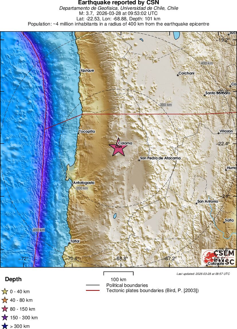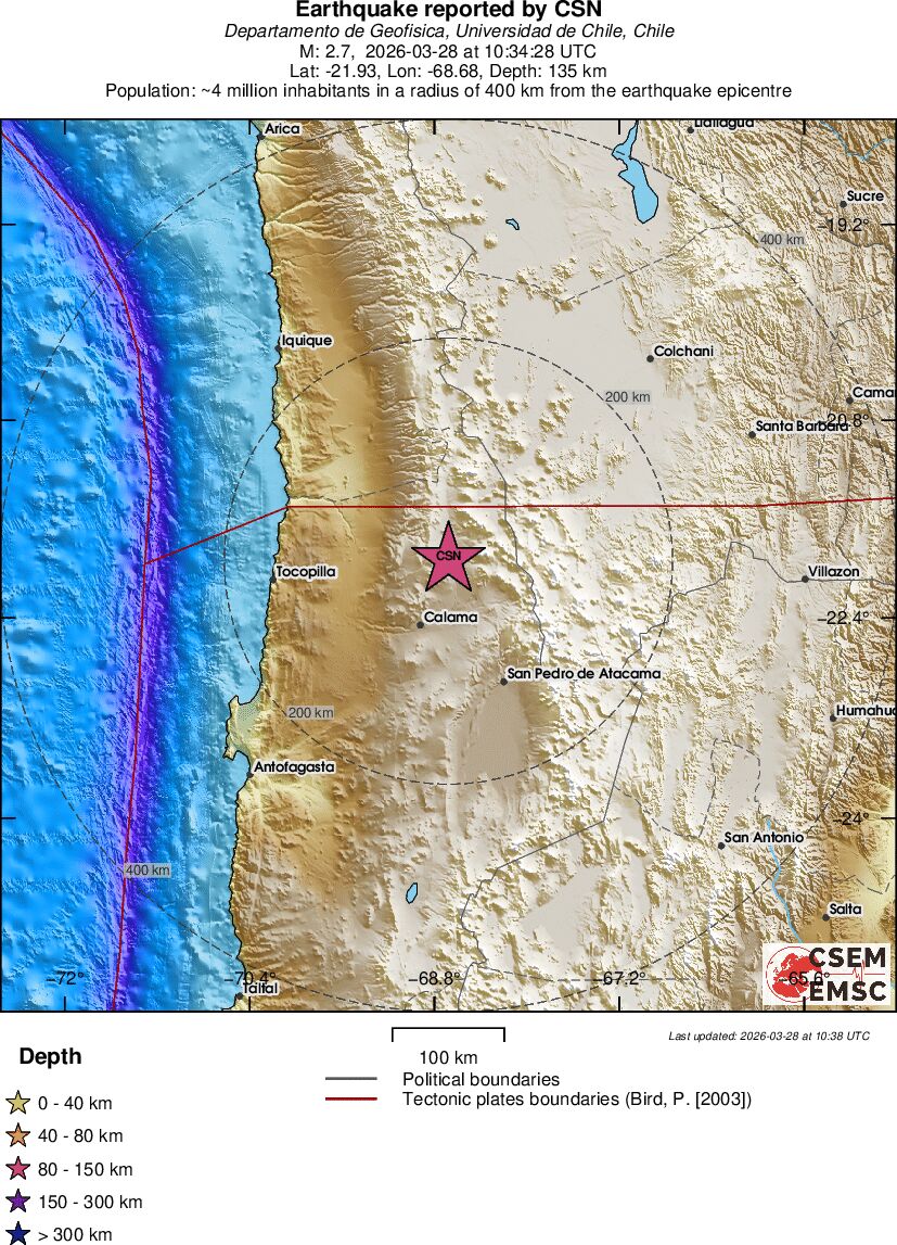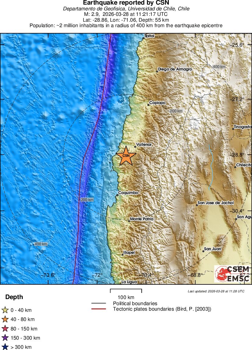 | 2.9 | 55.3 | 4228 | 06:21 | Link | Minor Earthquake - ATACAMA, CHILE - Today |