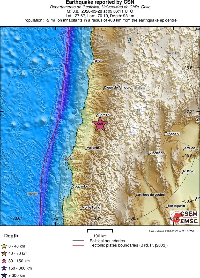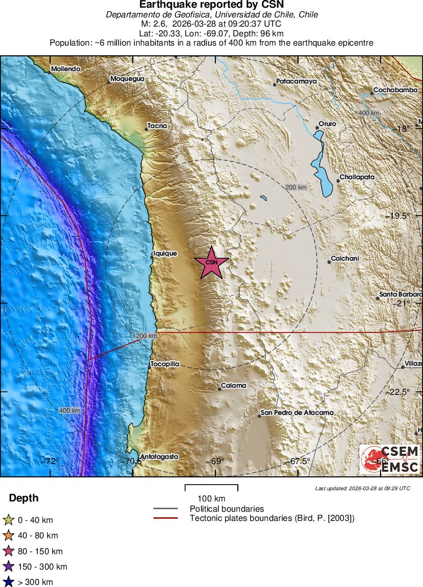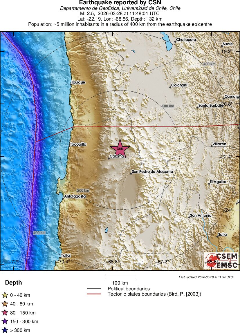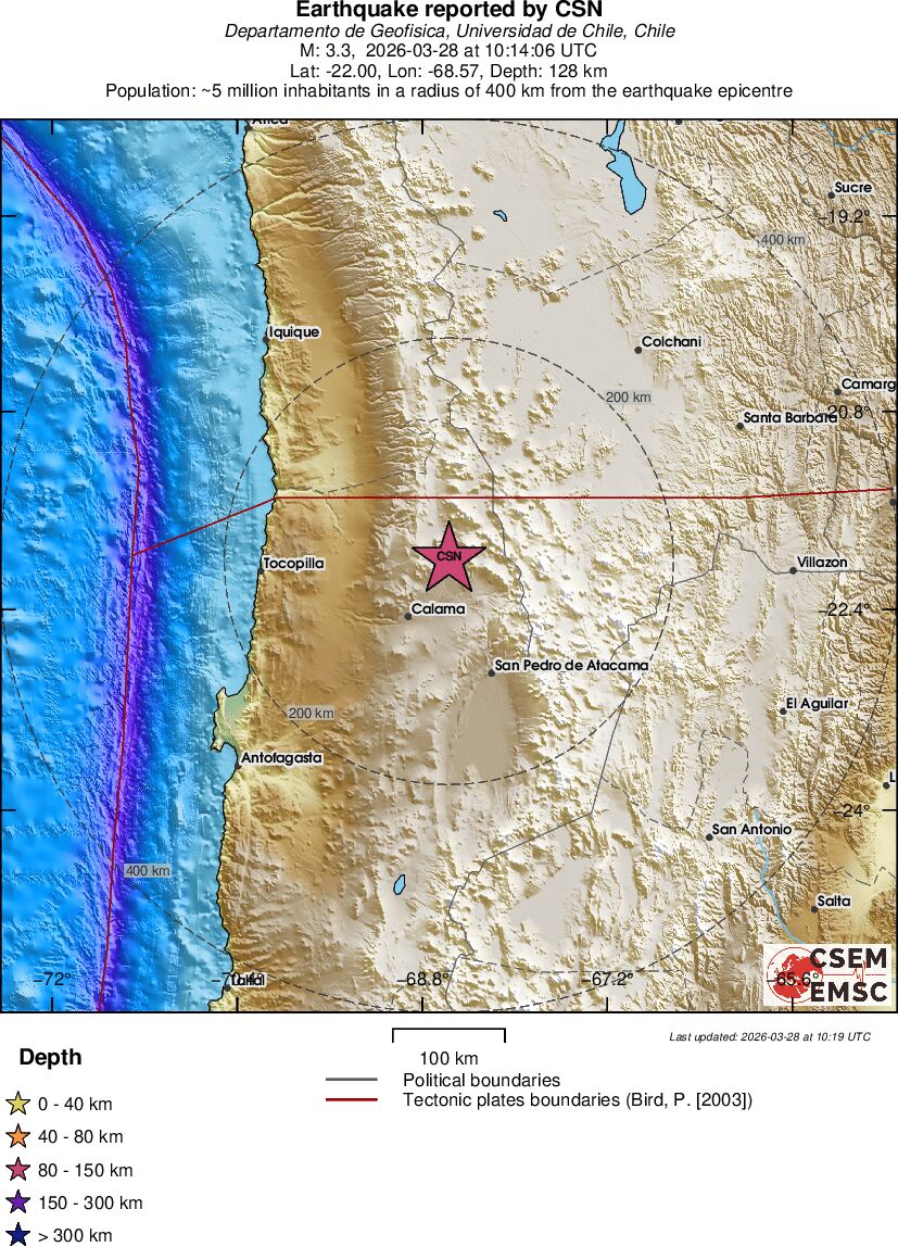 | 2.9 | 55.3 | 4228 | 06:21 | Link | Minor Earthquake - ATACAMA, CHILE - Today |