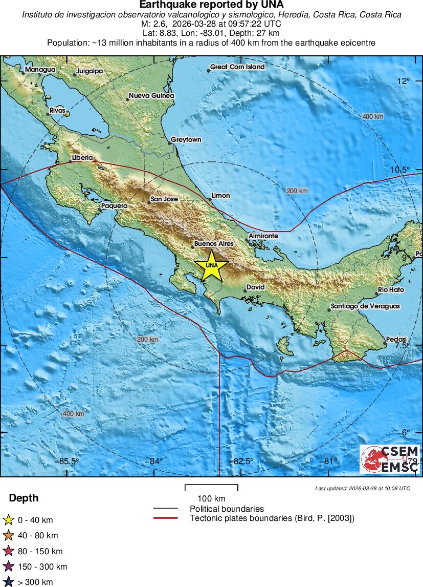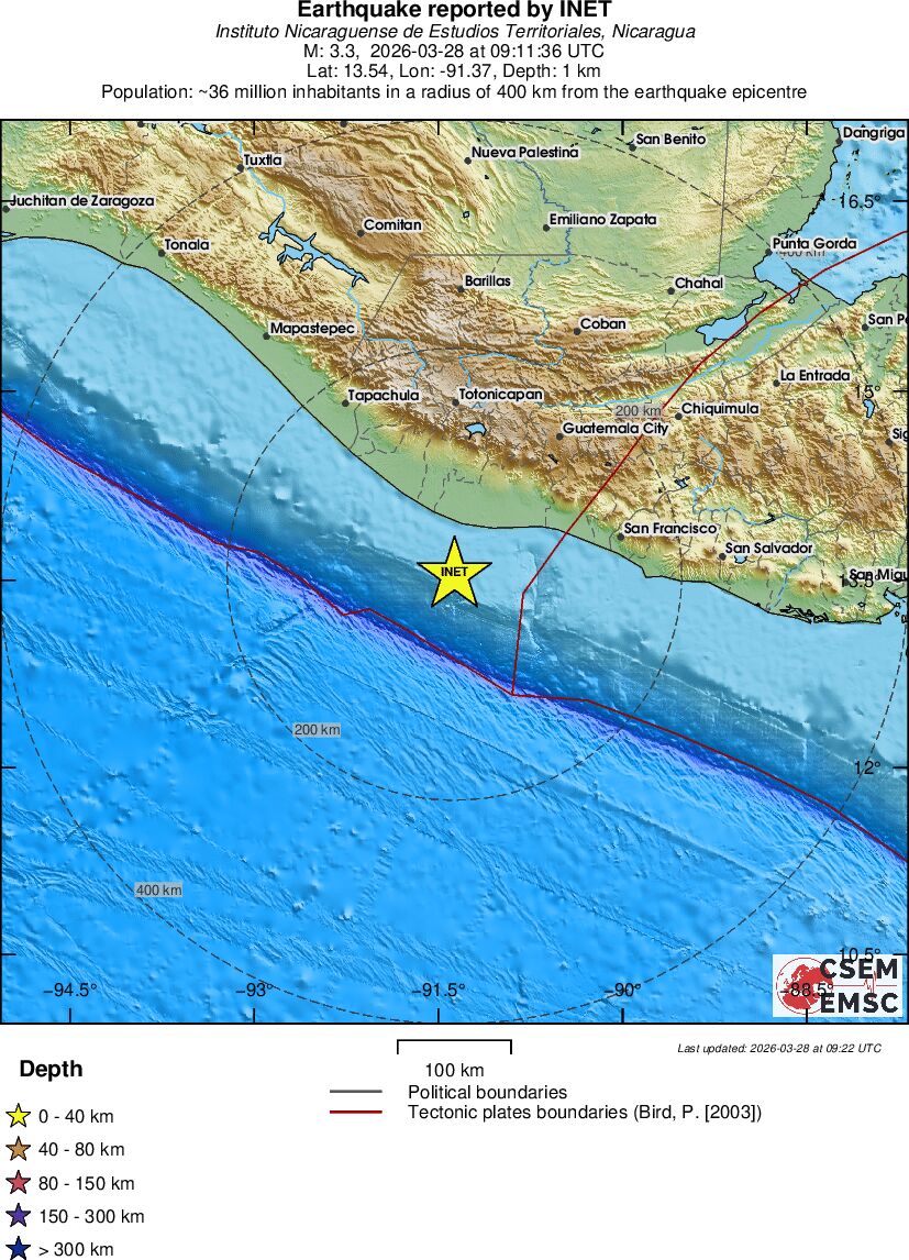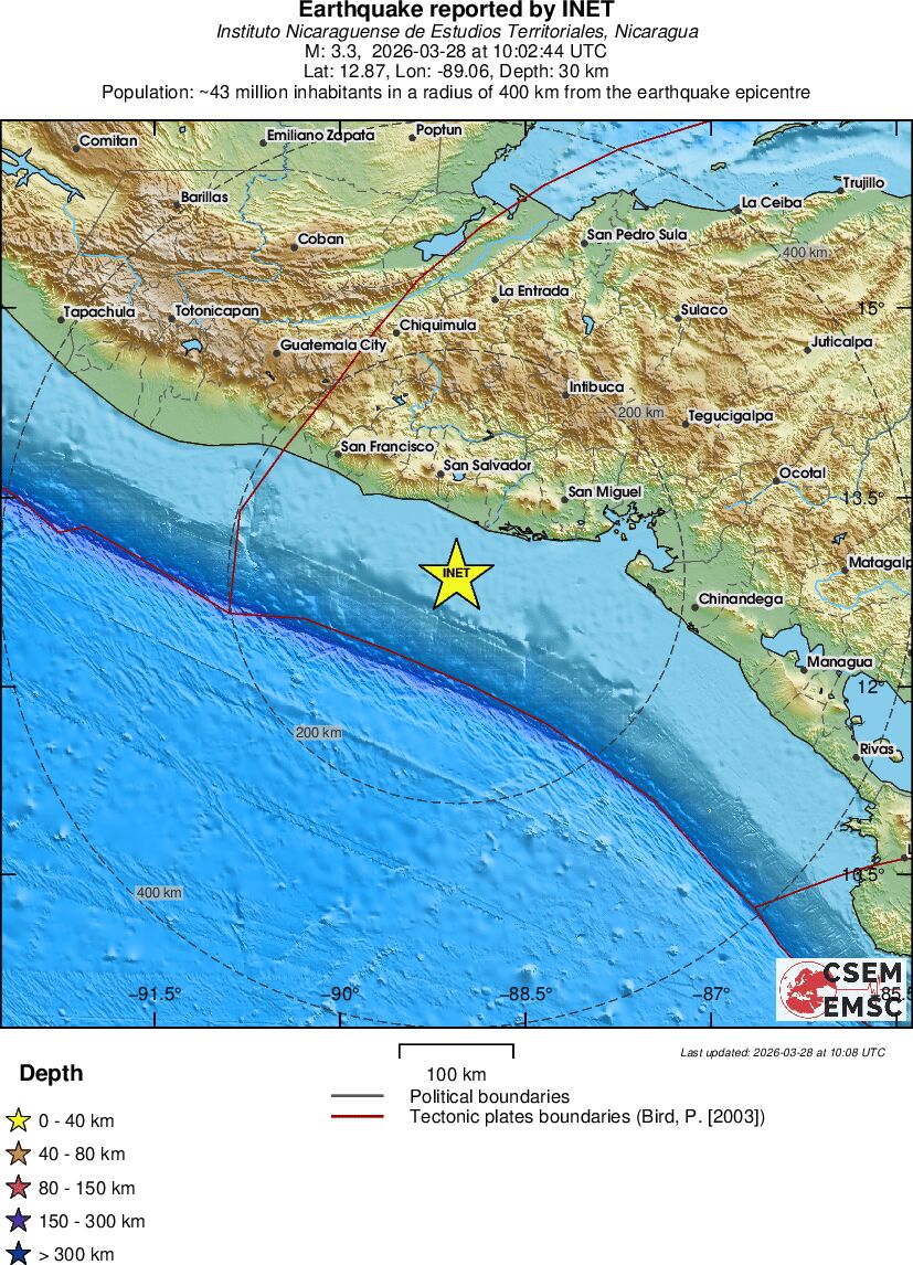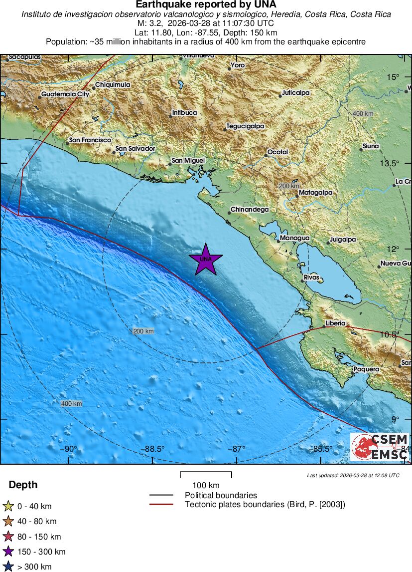 | 3.2 | 150 | 1281 | 06:07 | Link | Minor Earthquake - NEAR COAST OF NICARAGUA - Today |
