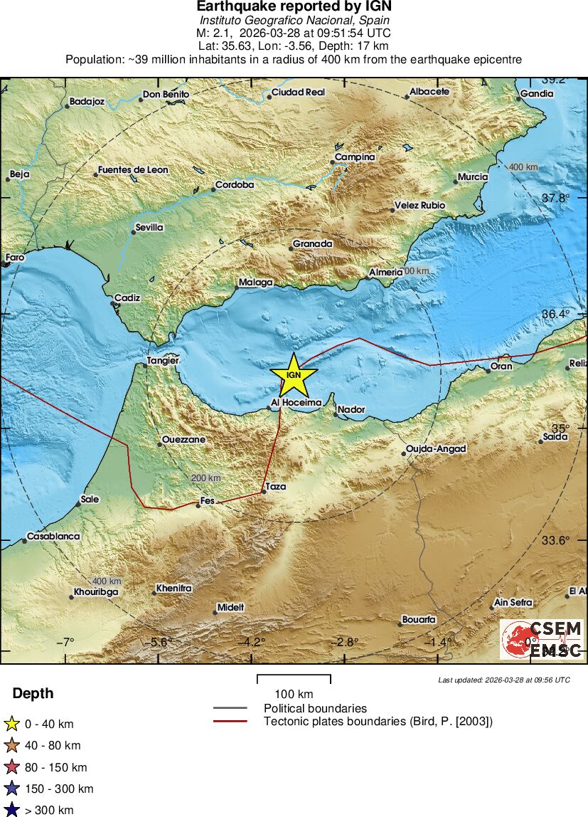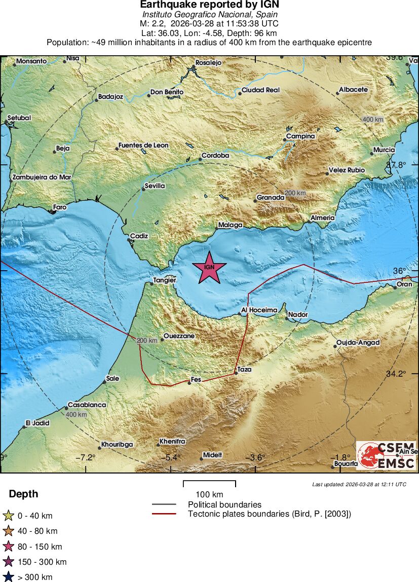 | 2.2 | 96.4 | 4655 | 06:53 | Link | Minor Earthquake - STRAIT OF GIBRALTAR - Today |