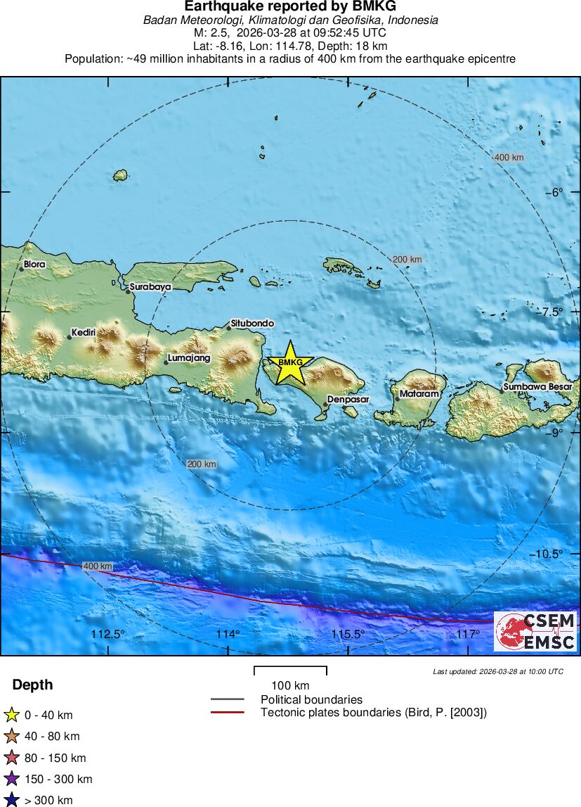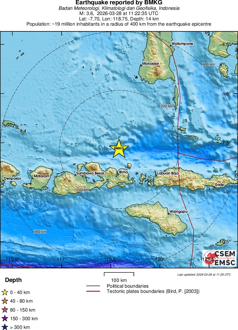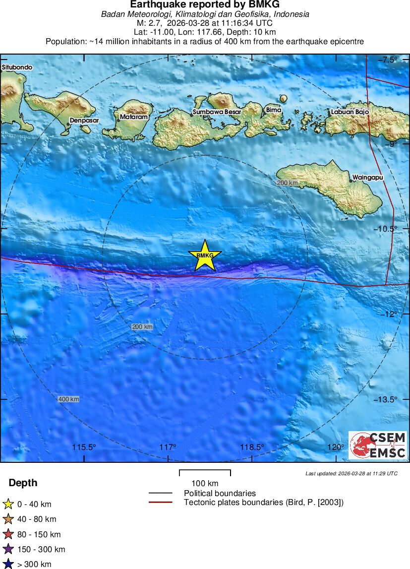 | 2.7 | 10 | 10350 | 06:16 | Link | Minor Earthquake - SOUTH OF SUMBAWA, INDONESIA - Today |
