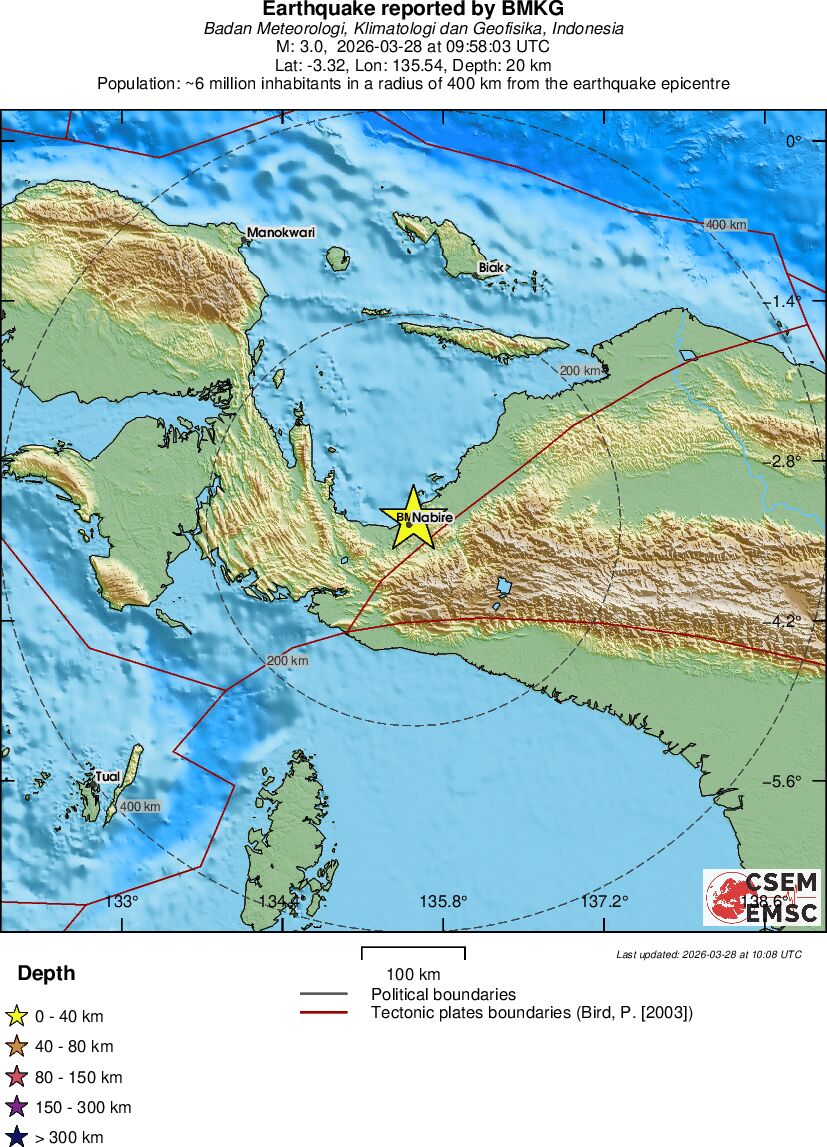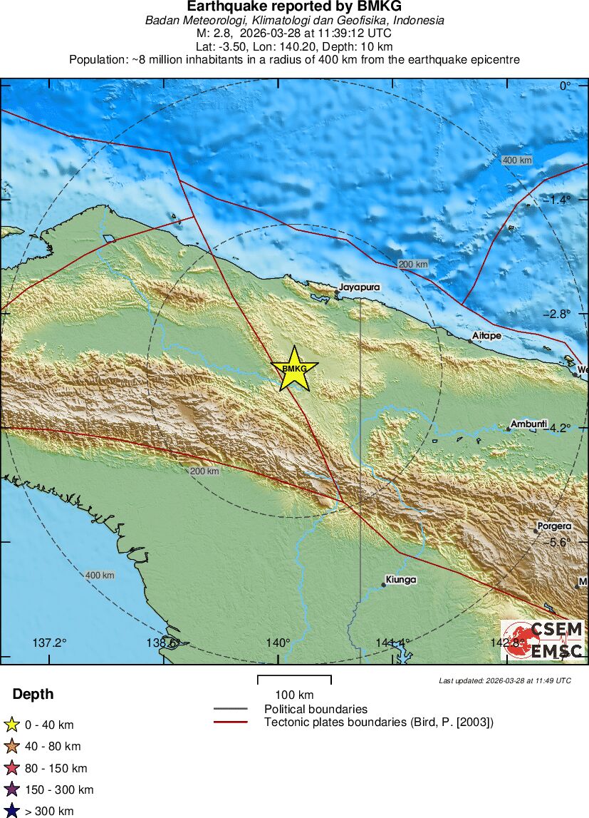 | 2.8 | 10 | 8827 | 06:39 | Link | Minor Earthquake - PAPUA, INDONESIA - Today |