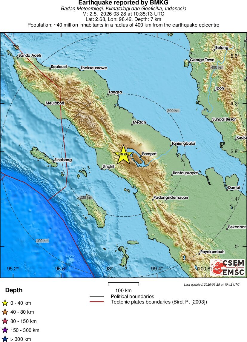 | 2.5 | 7 | 10125 | 05:35 | Link | Minor Earthquake - NORTHERN SUMATRA, INDONESIA - Today |