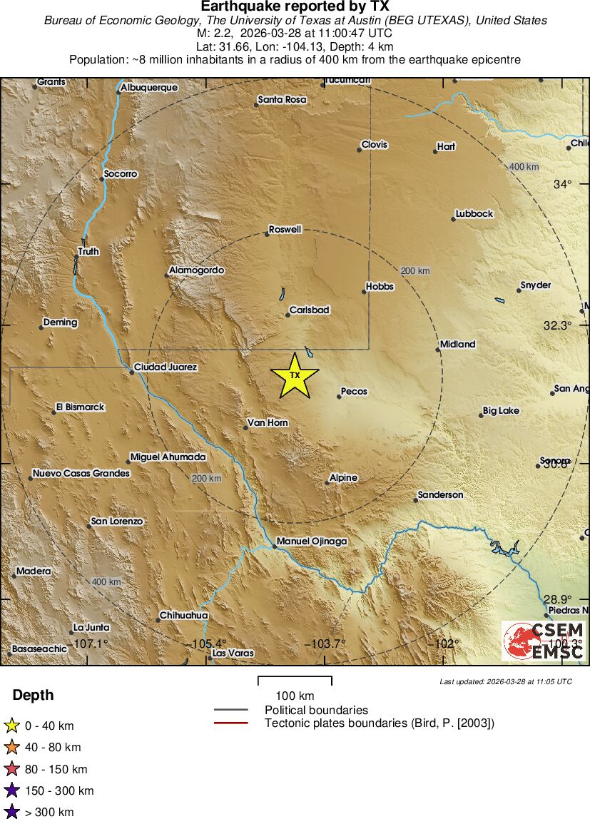 | 2.2 | 4.5 | 997 | 06:00 | Link | Minor Earthquake - WESTERN TEXAS - Today |