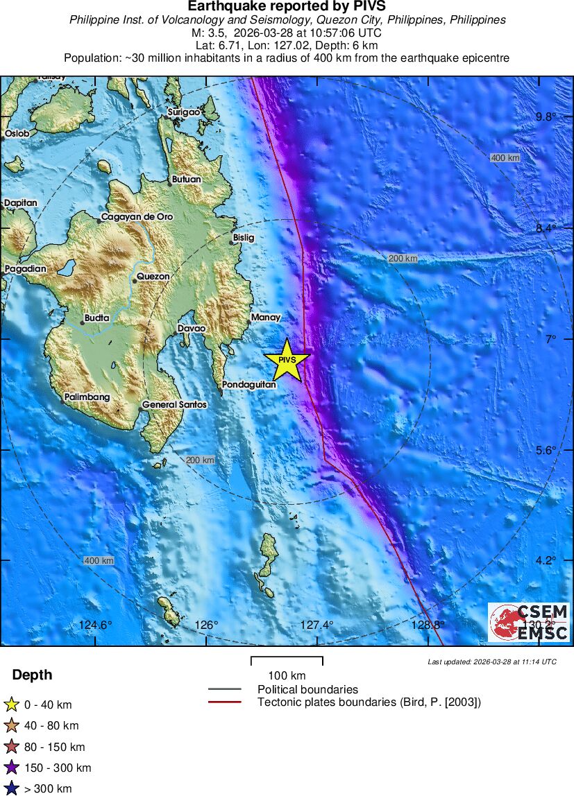 | 3.5 | 6 | 9012 | 05:57 | Link | Minor Earthquake - PHILIPPINE ISLANDS REGION - Today |