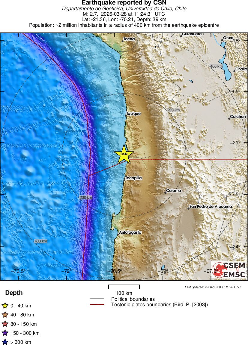 | 2.7 | 39.3 | 3749 | 06:24 | Link | Minor Earthquake - OFFSHORE ANTOFAGASTA, CHILE - Today |