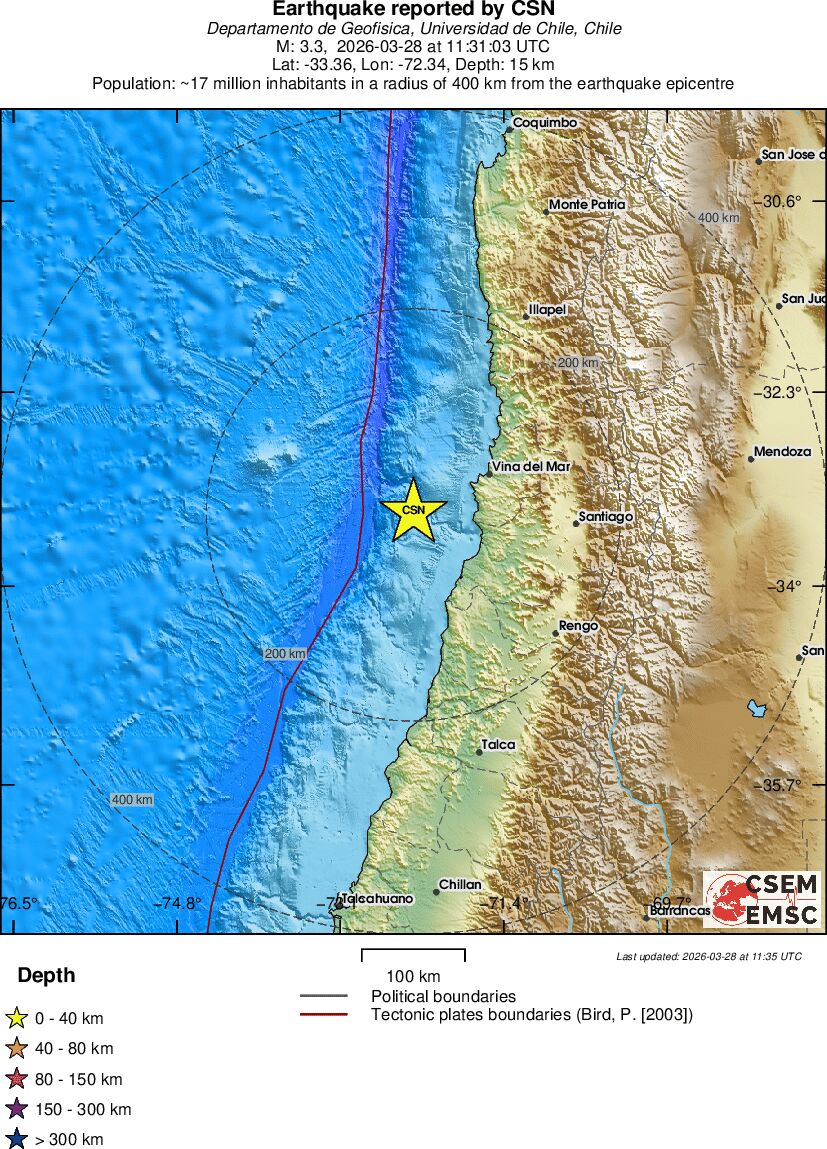 | 3.3 | 15.3 | 4509 | 06:31 | Link | Minor Earthquake - OFFSHORE VALPARAISO, CHILE - Today |