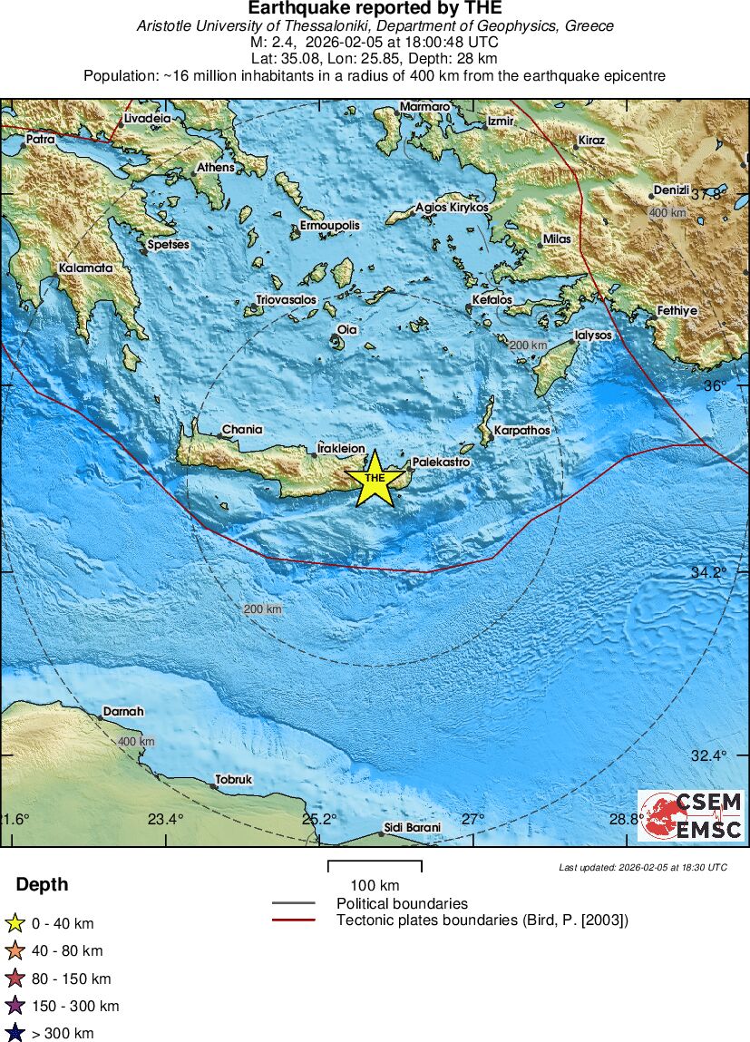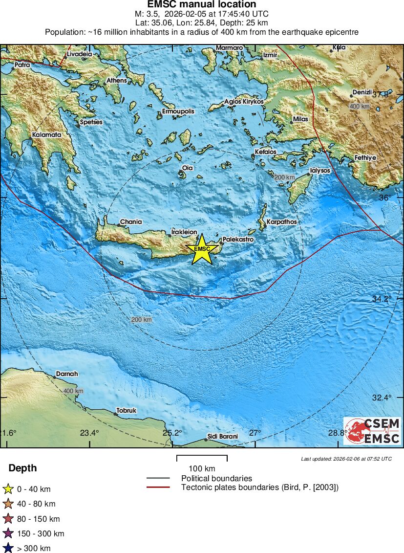 | 3.5 | 25 | 6171 | 11:45 | Link | Minor Earthquake - CRETE, GREECE - February 5, 2026 |