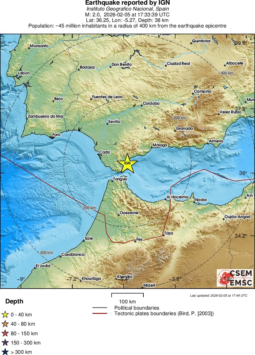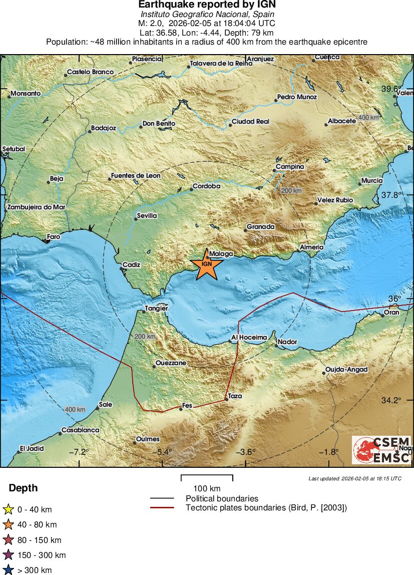 | 2 | 38.1 | 4613 | 11:33 | Link | Minor Earthquake - STRAIT OF GIBRALTAR - February 5, 2026 |