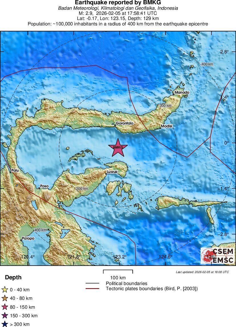 | 2.9 | 129 | 9547 | 11:58 | Link | Minor Earthquake - SULAWESI, INDONESIA - February 5, 2026 |