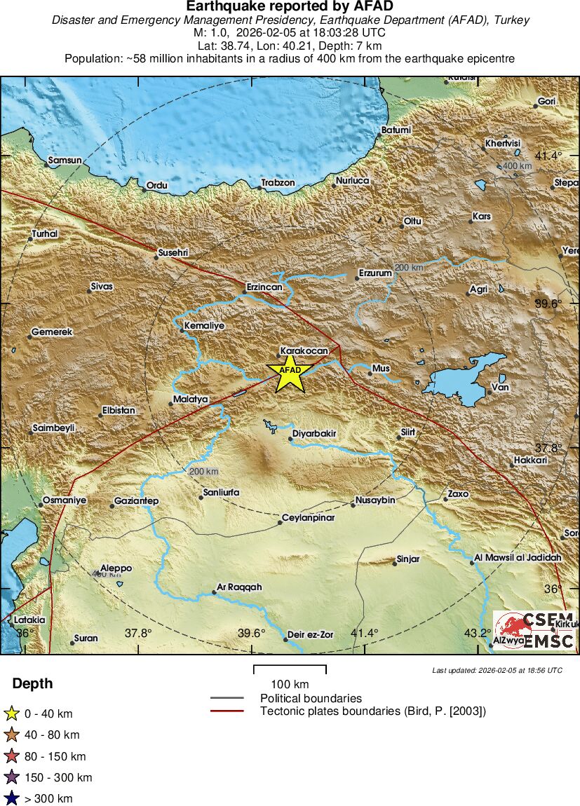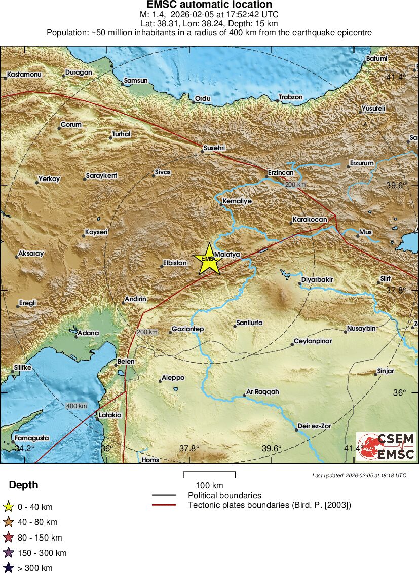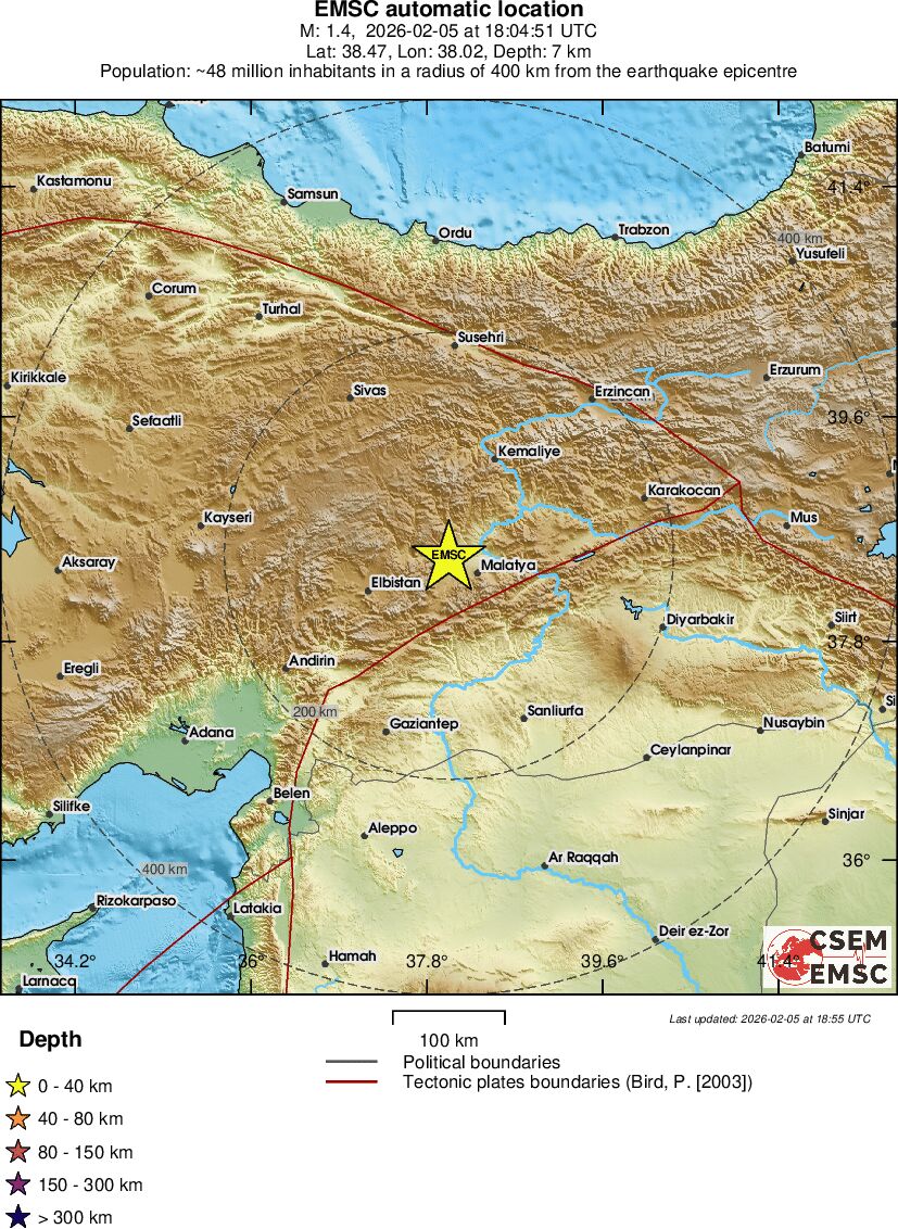 | 1.4 | 14.8 | 6540 | 11:52 | Link | Minor Earthquake - EASTERN TURKEY - February 5, 2026 |