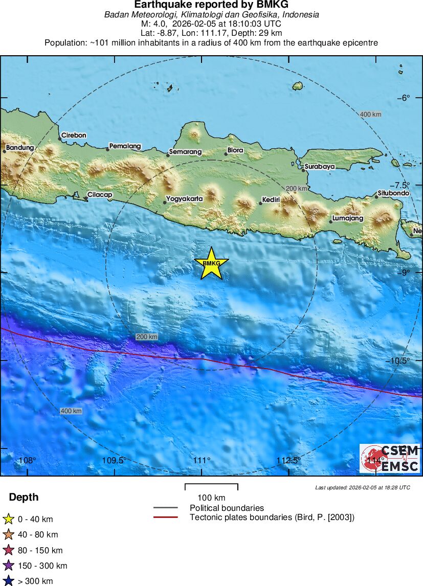 | 2.8 | 18 | 10534 | 12:16 | Link | Minor Earthquake - JAVA, INDONESIA - February 5, 2026 |