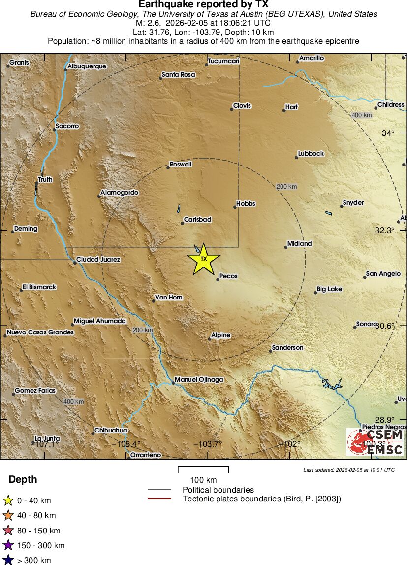 | 2.6 | 10 | 977 | 12:06 | Link | Minor Earthquake - WESTERN TEXAS - February 5, 2026 |