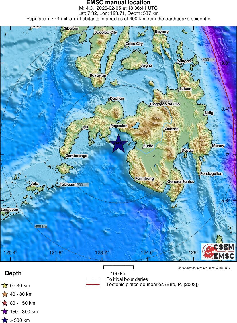 | 3.3 | 587.9 | 9114 | 12:36 | Link | Minor Earthquake - MINDANAO, PHILIPPINES - February 5, 2026 |