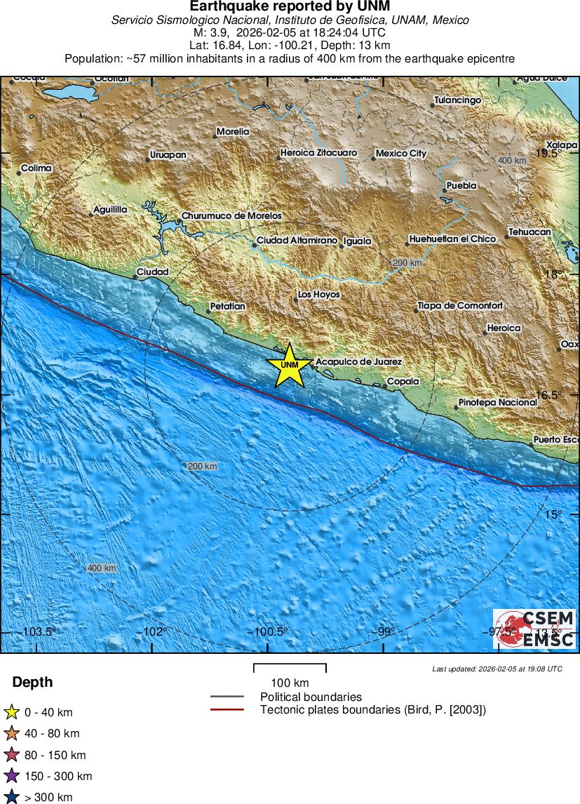 | 3.9 | 13.4 | 1235 | 12:24 | Link | Minor Earthquake - OFFSHORE GUERRERO, MEXICO - February 5, 2026 |