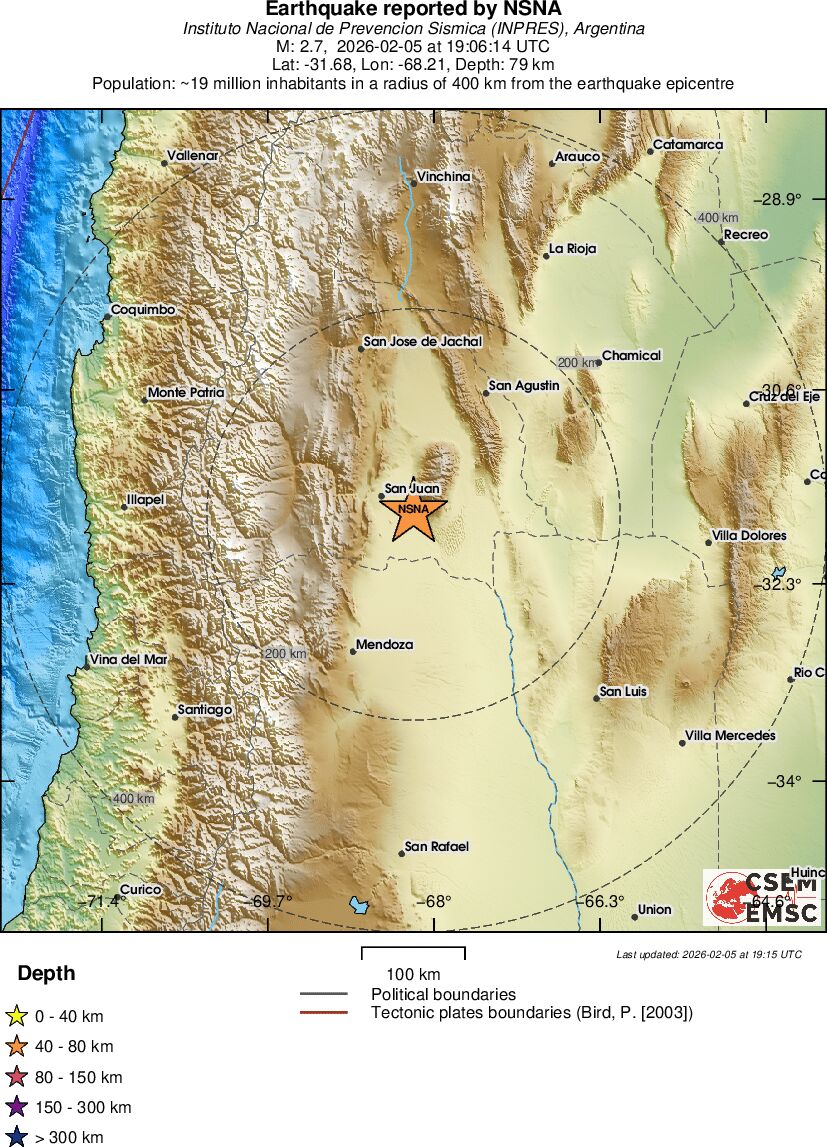 | 2.7 | 79 | 4465 | 13:06 | Link | Minor Earthquake - SAN JUAN, ARGENTINA - February 5, 2026 |