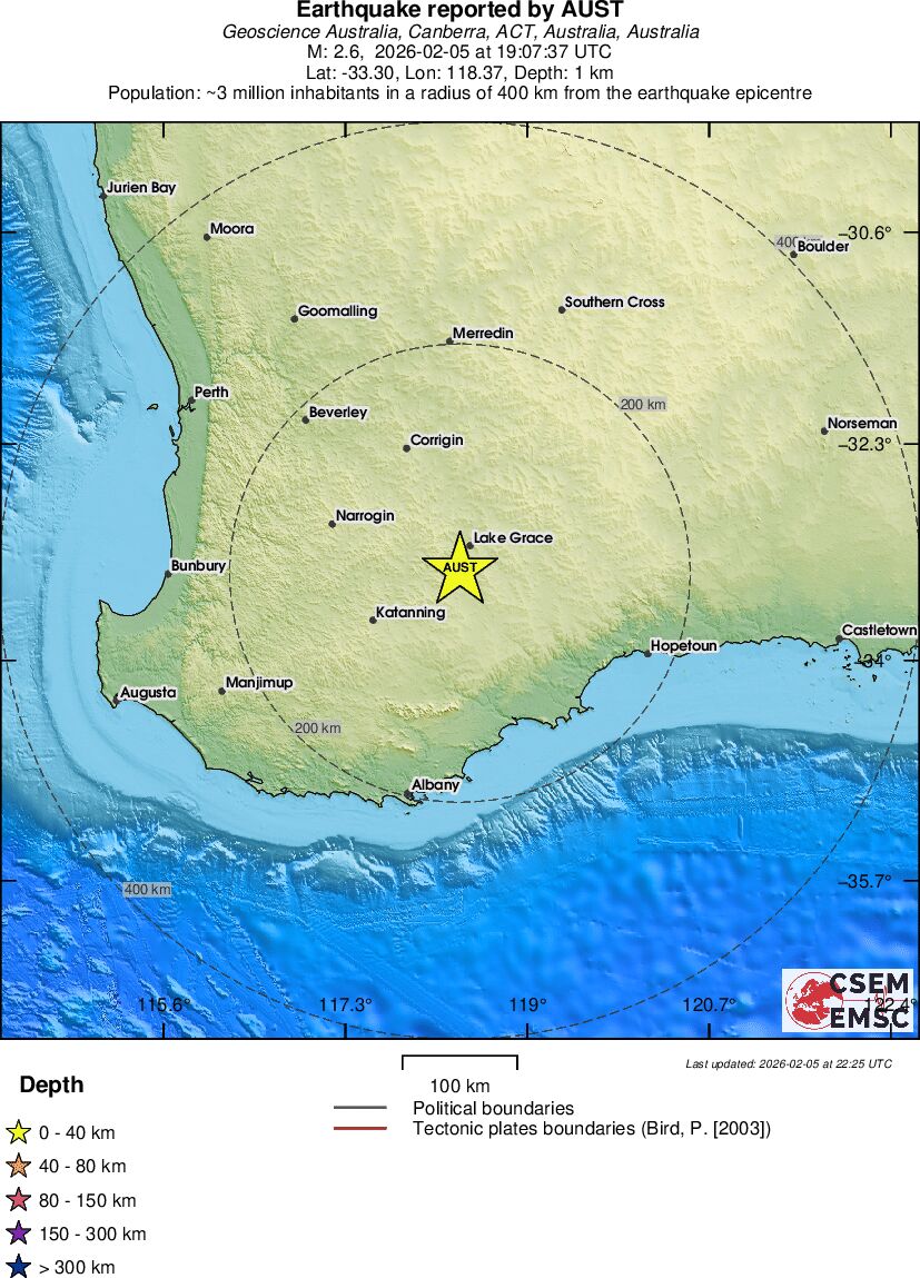 | 2.6 | 5 | 10923 | 13:07 | Link | Minor Earthquake - WESTERN AUSTRALIA - February 5, 2026 |