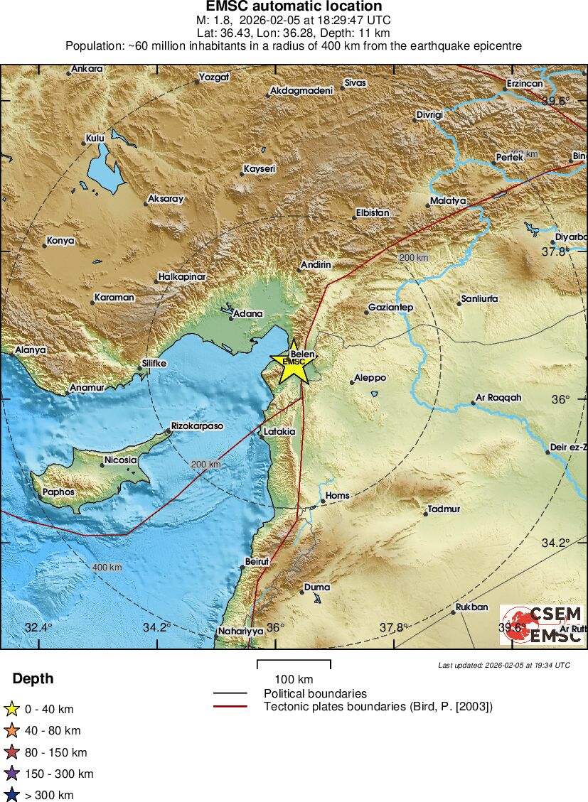 | 1.8 | 11.2 | 6554 | 12:29 | Link | Minor Earthquake - TURKEY-SYRIA BORDER REGION - February 5, 2026 |